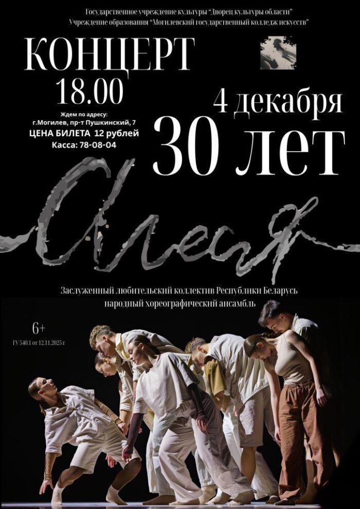Дорогие друзья!!! Приглашаем вас на концерт, посвященный 30-летию ансамбля «Алеся». Концерт состоится 4 декабря в 18.00 во дворце культуры области. В программе лучшие и любимые номера. А также работы, принимавшие участие в престижных международных и республиканских конкурсах. С нетерпение ждем встречи !!! Будет очень много красоты и душевности!!!